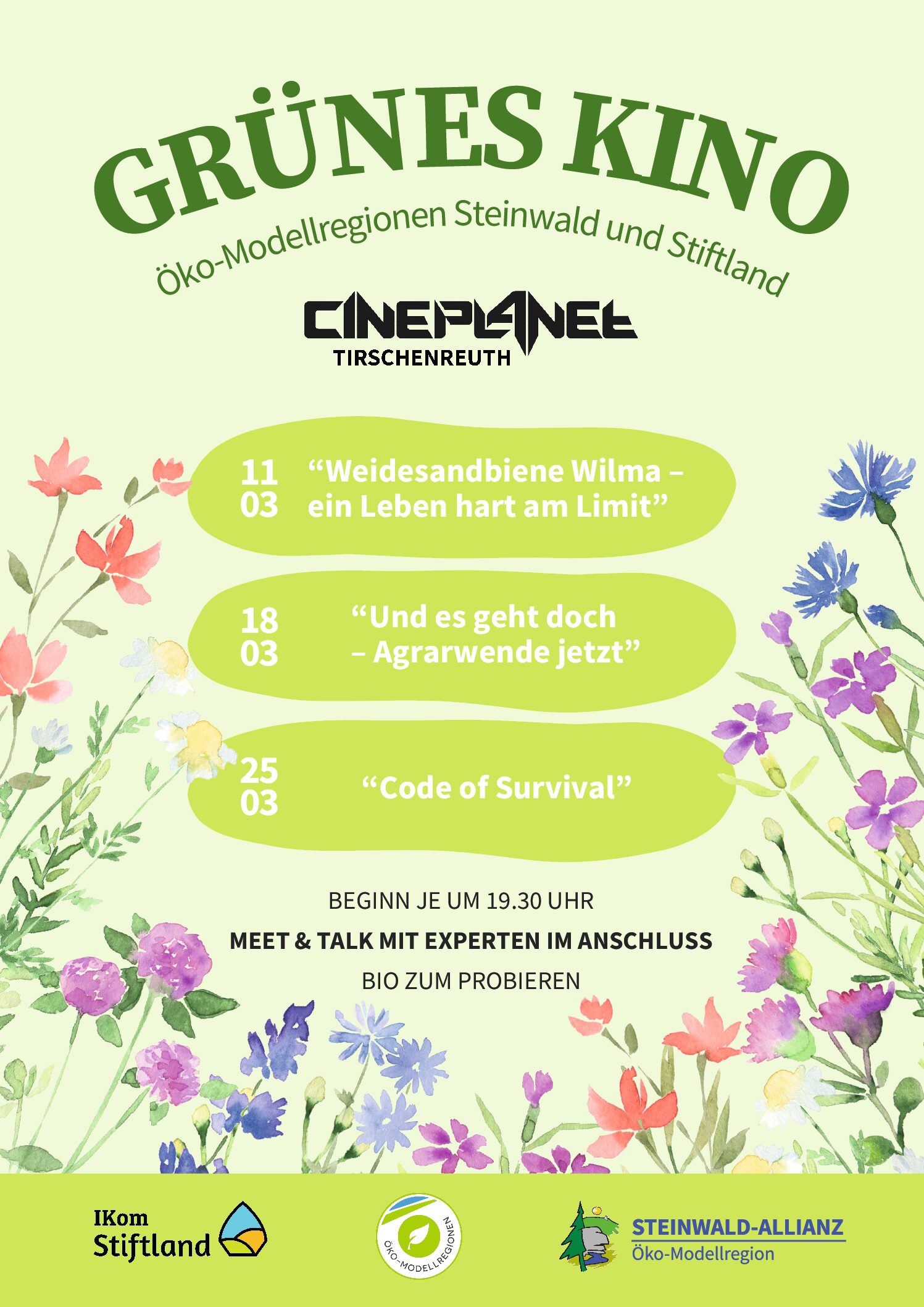 Bereits zum vierten Mal veranstaltet unser Partnerverband Steinwald-Allianz mit ihrer Öko-Modellregion Steinwald und der angrenzenden Ökomodellregion Stiftland die mehrteilige Filmreihe „Grünes Kino“ im Cineplanet Tirschenreuth. Das Projekt der beiden Öko-Modellregionen bezieht sich auf die Bewusstseinsbildung und soll Augen, Ohren